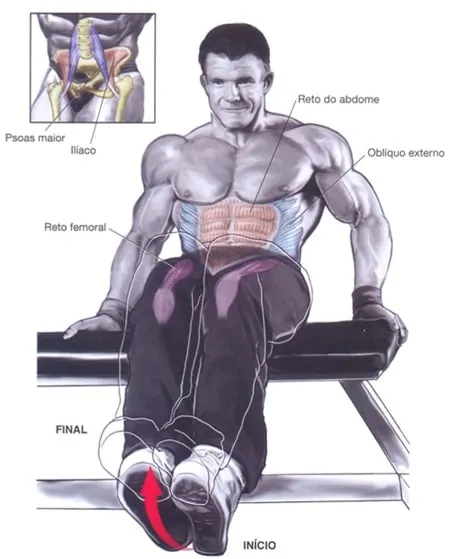 Modo de execução: Sente-se na extremidade de um banco. Com as pernas a pender e os joelhos ligeiramente dobrados, agarre o banco. Eleve os joelhos na direção do peito, mantendo as pernas juntas. Faça as pernas regressarem à posição inicial e repita o movimento.